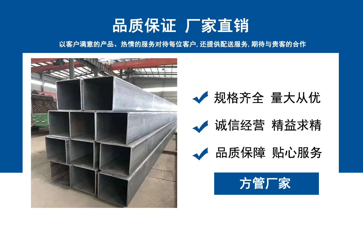山東方管廠主要生產Q355B方管,Q355C方管,Q355D方管,Q355E方管,低合金方管等,曾多次為客戶解決了各種無縫管疑難問題,經不斷的創新與努力,得到了客戶良好的信譽和稱贊。  公司秉承質量、服務是我們尋求發展的唯一途徑,為客戶提供極具市場競爭力的高品質產品,愿與客戶一起進步、共享成功!  我公司秉承“誠信經營,服務周到”的經營原則,全力以赴,給客戶周到滿意的服務?!罢\信、專業、認真、服務”是我們的宗旨。幾年來我們用專業的技術和周到的服務贏得了廣大客戶和供應商的信賴,與各大企業有著廣泛的合作和聯系,受到了業內好評。我們會以優良的產品、優惠的價格、優先的貨期、優良的服務,珍惜客戶給予我們的每一個機會。...